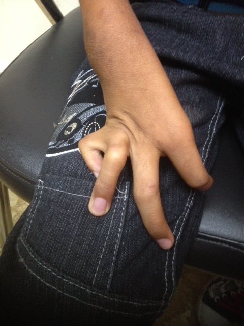Carlos has type V thumb hypoplasia, Complete absence of his right thumb. Carlos’ clinical exam revealed that he has an intact FDP to his ring finger, but no flexor tendon function to his small finger. Carlos also presents with a fused right elbow and scoliosis.