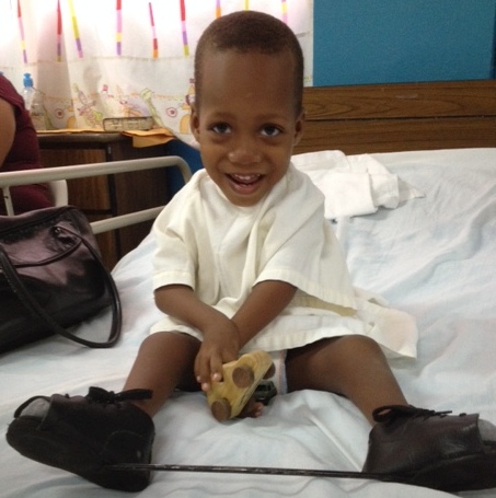 Engel has arthrogryoposis and bilateral club foot. You can see here that he is wearing a foot abduction bar attached to his shoes that is similar to the Denis Browne bar for the non-surgical management of club foot. The bar is usually worn for 6-12 months at night to treat rotation deformities.