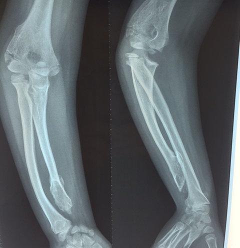 The X-Ray reveals much more than a congenital dislocating radial head. A combination of congenital deformities is common to find during the exam process. Diego also has exostosis (benign outgrowth of new bone from the surface of bone), an abnormal distal ulna, and radial bowing. Many children with congenital deformities have multiple issues and conditions simultaneously. Often it is necessary for these children to have staged or multiple surgeries.