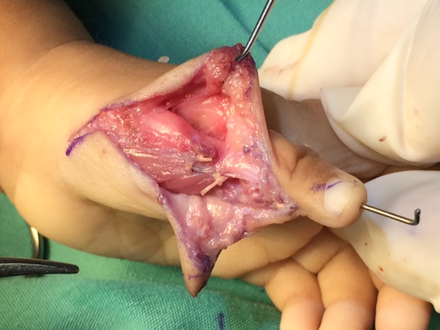 - Excision of the extra thumb, reserving the necessary structures for the dominant thumb
